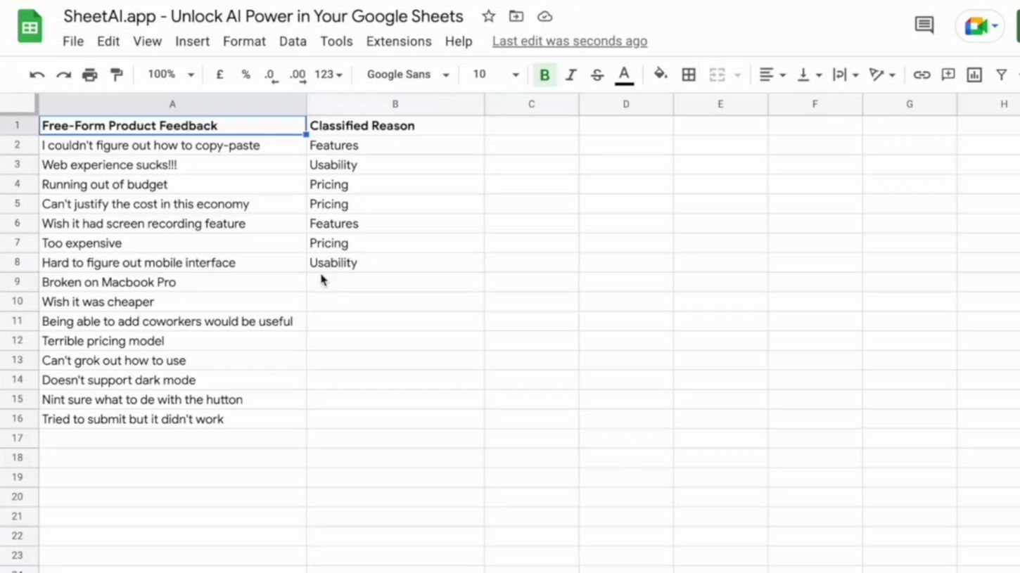 SheetAI enhances Google Sheets with a suite of AI-driven functions, making it easy to automate tasks and gain valuable insights from your data.